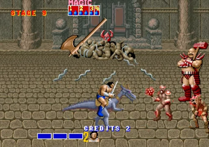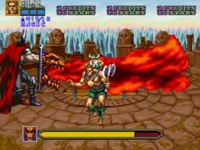 Death Adder appears with the Golden Axe and a large shield with a dragon head. The shield can release fireballs, flames, or lightning from its mouth, and will swallow Magic Pots if the player attempts to use magic. After taking several hits, the shield breaks and Death Adder can be hit with magic, but he will also use his own magic, charging energy and then punching the ground to unleash a wide shockwave.