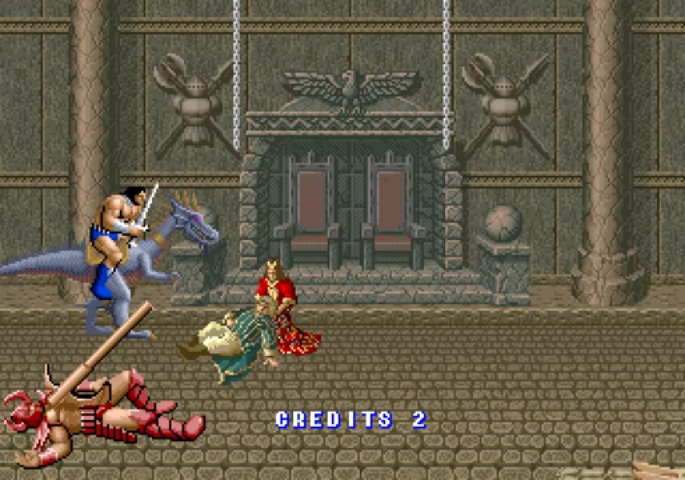 After defeating Death Adder, the castle begins to crumble and the heroes take off on the back of the dragon. Death Adder ambushes the heroes by climbing atop the dragon's back and challenges them all once more. Weakened, Death Adder attempts to destroy the heroes by conjuring a huge spell, but is interrupted when Gilius strikes Death Adder in the head with his axe. Both Death Adder and Gilius fall from the dragon and Death Adder's spell causes a large explosion, engulfing them both.