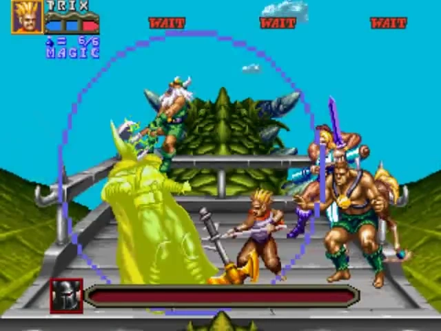 Some time after Dark Guld's defeat, Gilius, Tyris and Ax Battler are attacked and captured by the minions of Sorcerer Blackspell, who plans to use one of them in a spell to revive Dark Guld. Choosing Tyris, he orders the Lizard Woman Ridia to kill Gilius and Ax. Due to his small size, Gilius's feet was not chained, and he kicked Ridia, making her accidentally cut one of Ax's chains. Ax knocks down Ridia and takes her keys to free themselves. After helping Tyris in her escape, Ax is captured, but Gilius and Tyris free him and use their magic to defeat Dark Guld.