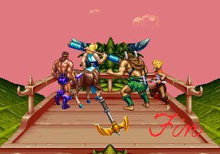 In his journey to find it, Gilius notices that the once peaceful kingdom of Splash Hill from East Land became evil and had a new ruler, Damned Hellstrike. Convinced that it was the work of the Golden Axe, and being in no condition to fight due to his age, Gilius took it to himself find a new hero to save the people. Before long, four brave warriors gather in front of him to fight another axe war. Damned Hellstrike learned of the old dwarf's plan and laid a curse upon each of the four warriors to ensure that nobody could challenge his reign.
